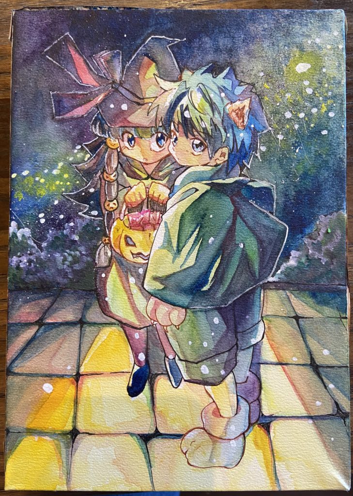 今回もアナログ、透明水彩です。A5サイズのパネルに水張りをして描きました。